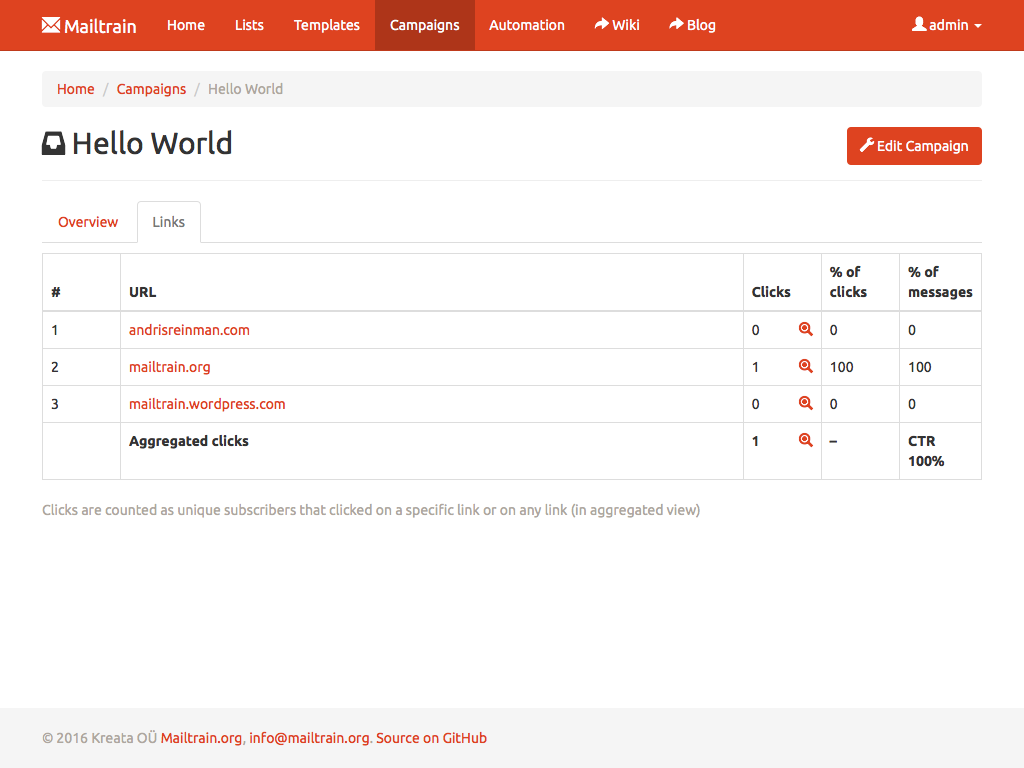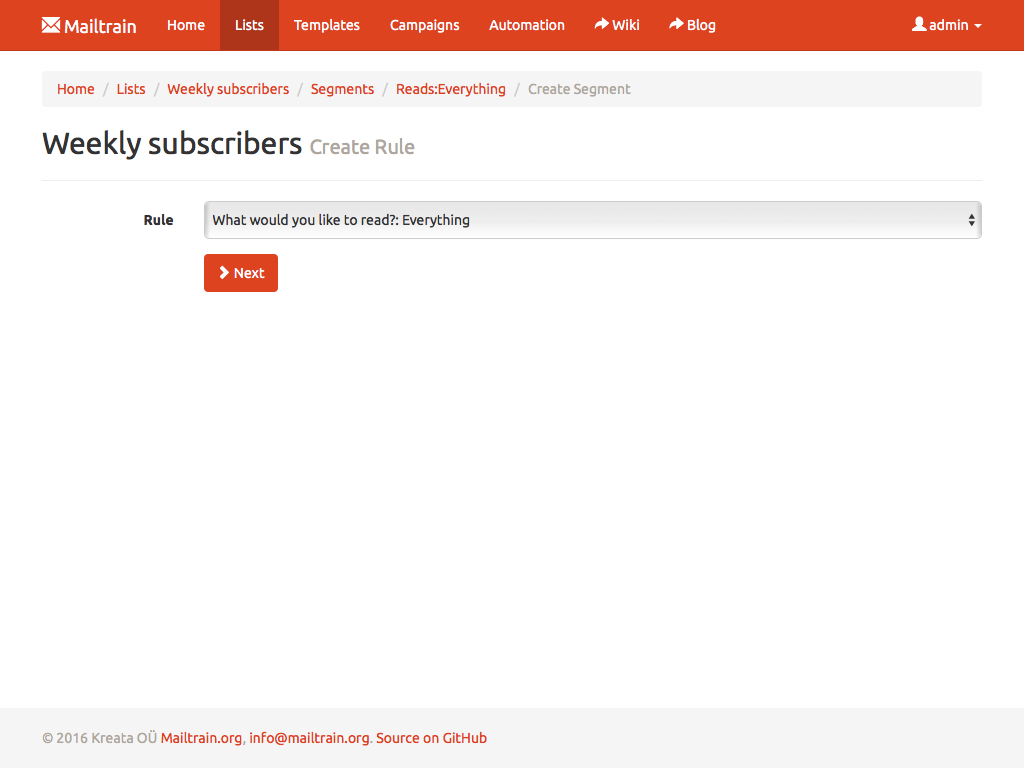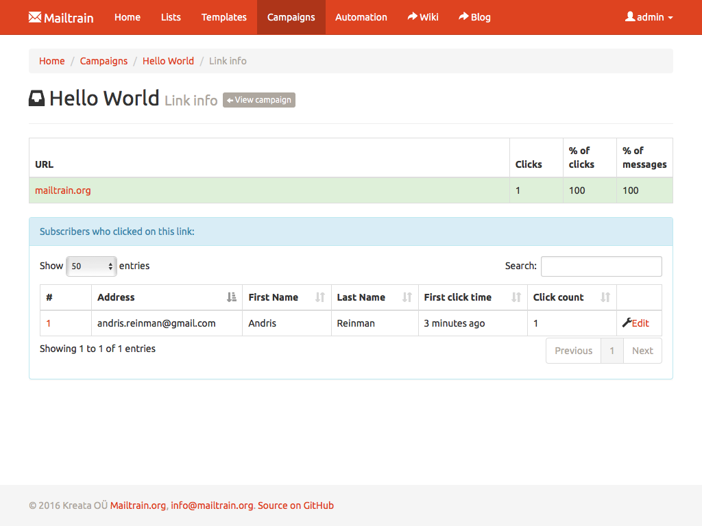 Mailtrain allows you to easily manage even very large lists. Million subscribers? Not a problem. You can add subscribers manually, through the API or import from a CSV file. All lists come with support for custom fields and merge tags as well.